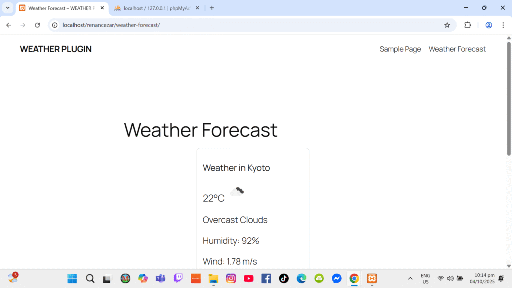 “A custom Weather API plugin was developed to fetch real-time weather data from an external API. The plugin uses a WordPress shortcode to display weather information on the frontend. API requests are handled using PHP, and basic caching is implemented to reduce repeated API calls.”