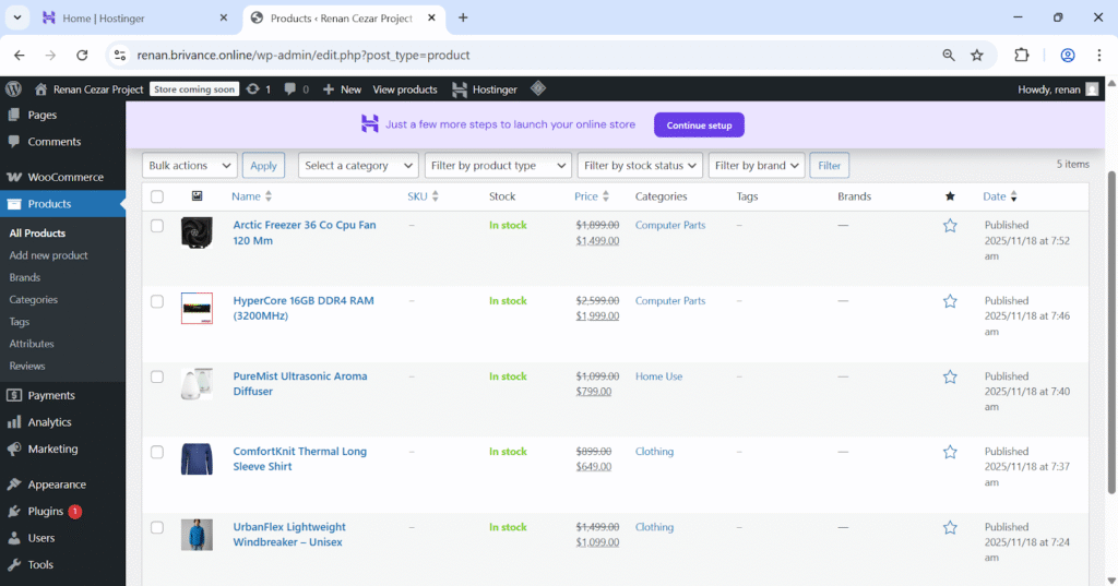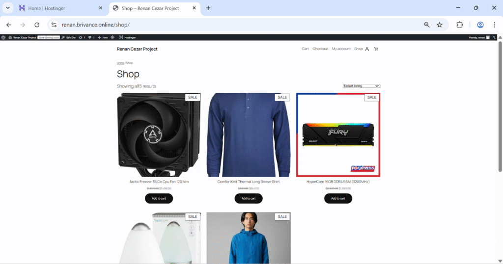 WooCommerce was installed and configured to enable e-commerce functionality. Products, prices, and shop pages were set up successfully.