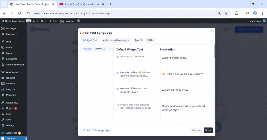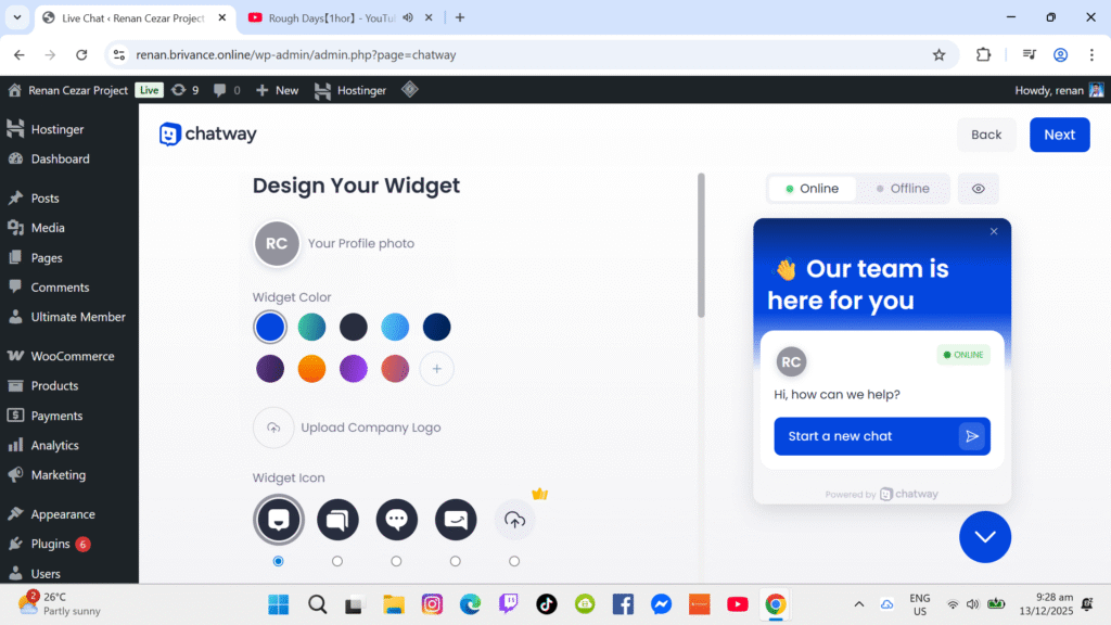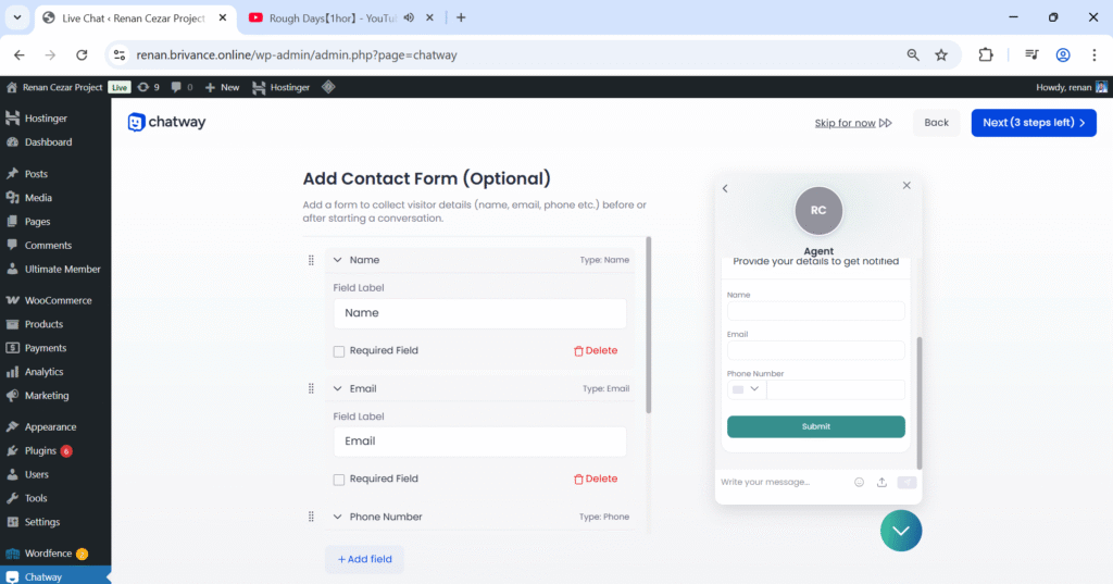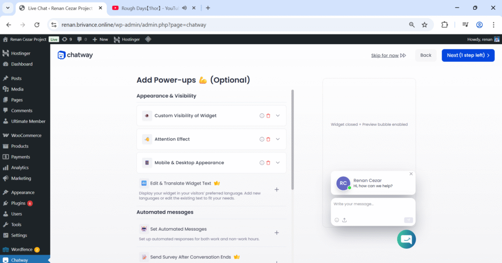 The Chatway plugin provides real-time chat functionality. It was configured to display a chatbot widget on all pages.