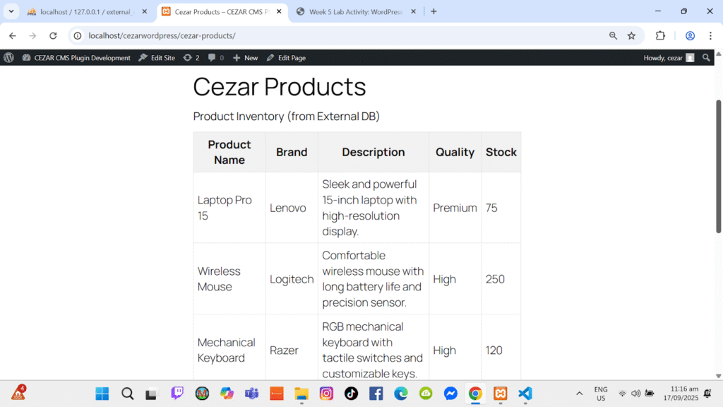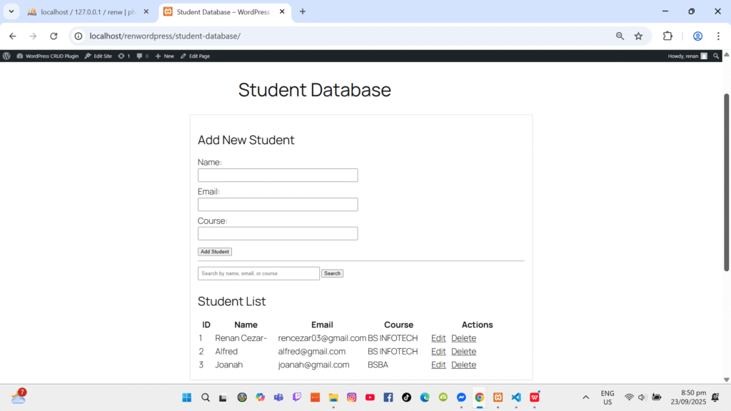 This plugin demonstrates full CRUD functionality using a custom admin menu. Data can be added, edited, and deleted from the WordPress backend.