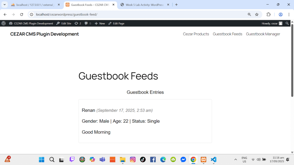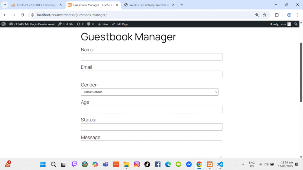 “This CMS plugin extends the basic Guestbook concept by adding structured fields such as age, gender, and status. It allows administrators to manage, update, and organize submitted records more effectively, demonstrating enhanced data handling and content management in WordPress.”