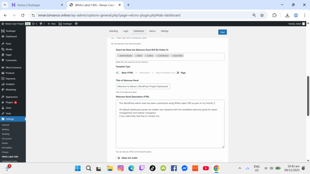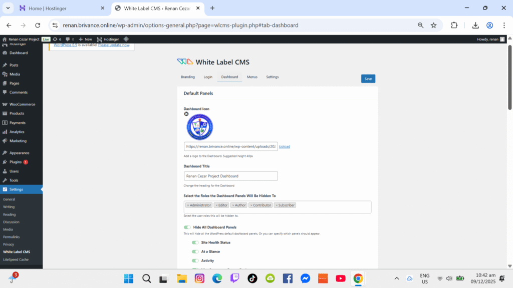 The White Label plugin was configured to customize the WordPress admin interface, removing default branding and creating a personalized dashboard.